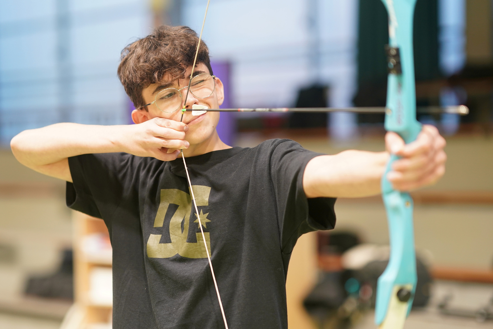 Antoine nous a permis d'approcher mais aussi de tirer sur ses arcs tout droits venus du Moyen age : longs bows et arc équestre (ici sans cheval)...